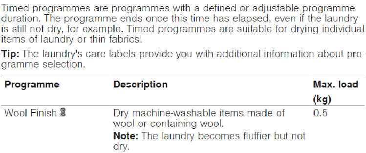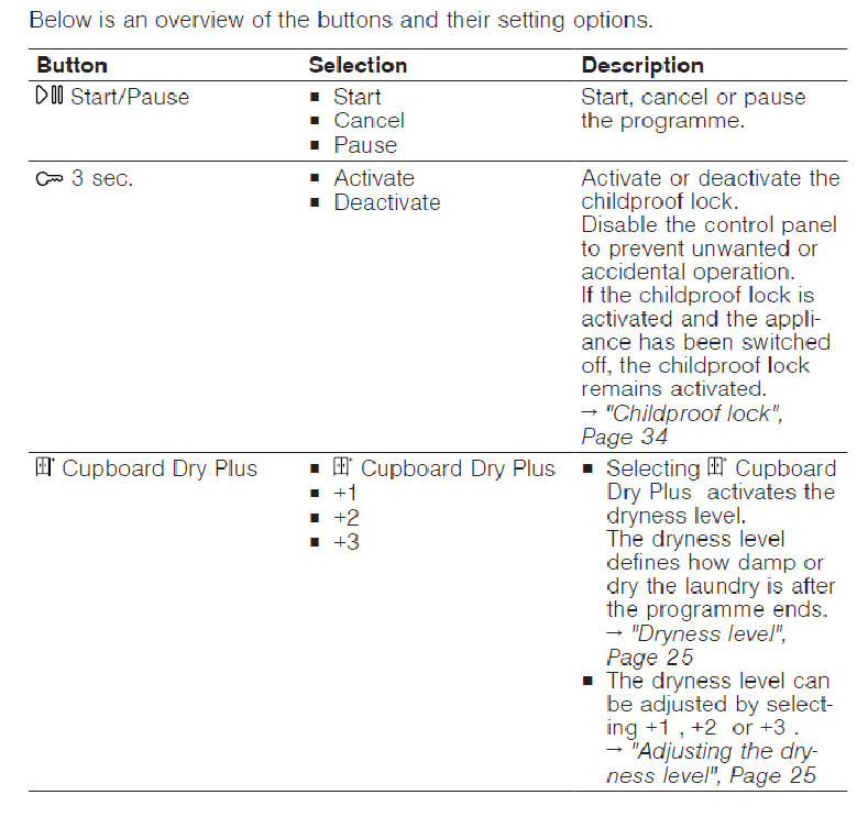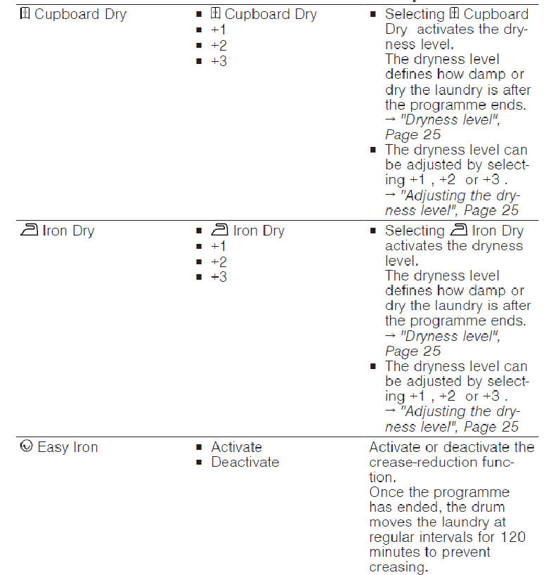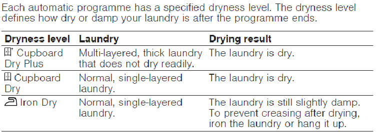 Two settings Normal Dry and Extra Dry. Programmes automatically close when items are dry. So important to put similar speed drying items in same load.